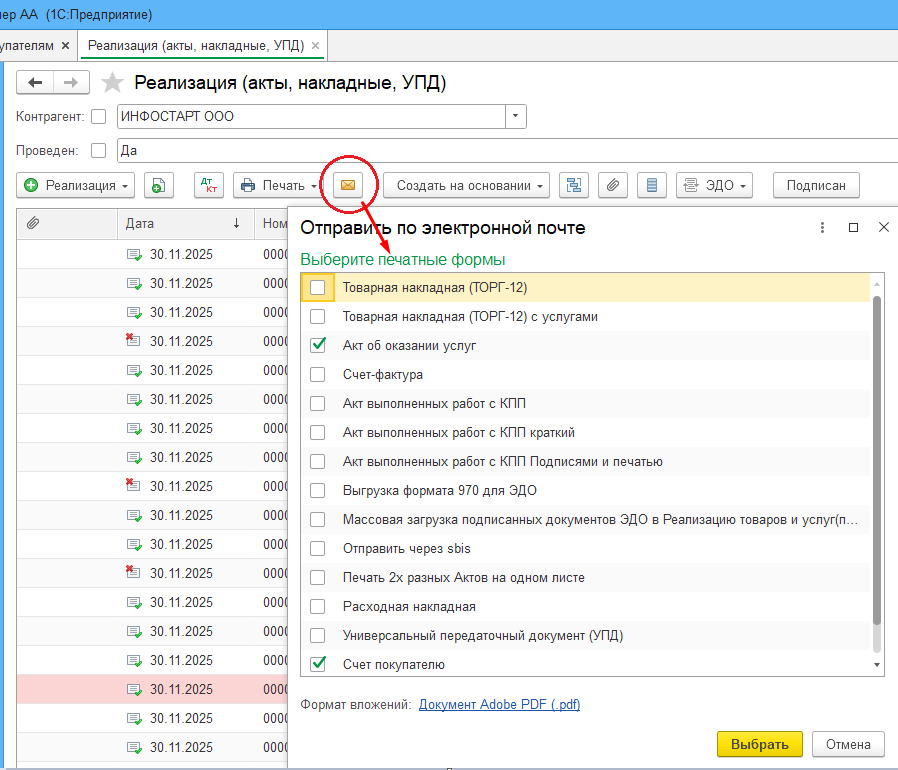 При отправке почты например счетов или реализаций возникает серьезная задержка от 30 до 50 секунд пока 1с трудится над созданием zip архивов с ЭДО файлами. Что бы ускорить процесс, данное расширение выключает формирование архивов с ЭДО, что позволяет сократить время формирования письма до пары секунд.