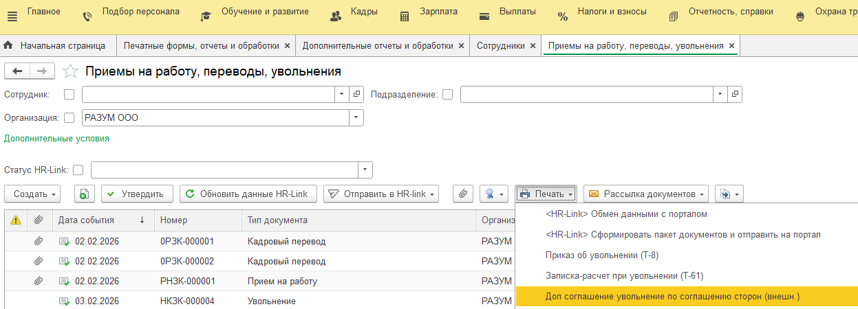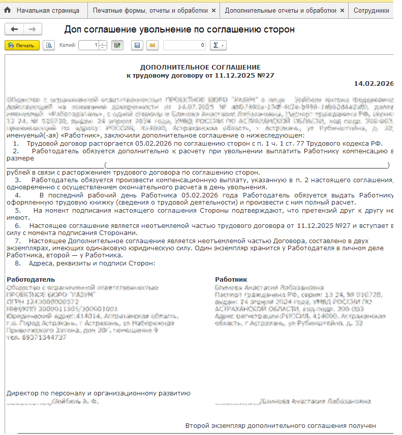 | ЗУП3.1 печатная форма Доп соглашение увольнение по соглашению сторон + HRLINK | - | 1 500.00 |