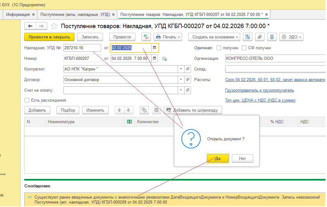 При вводе номера или даты входящего документа выполняется проверка на существование других документов с такими же номерами